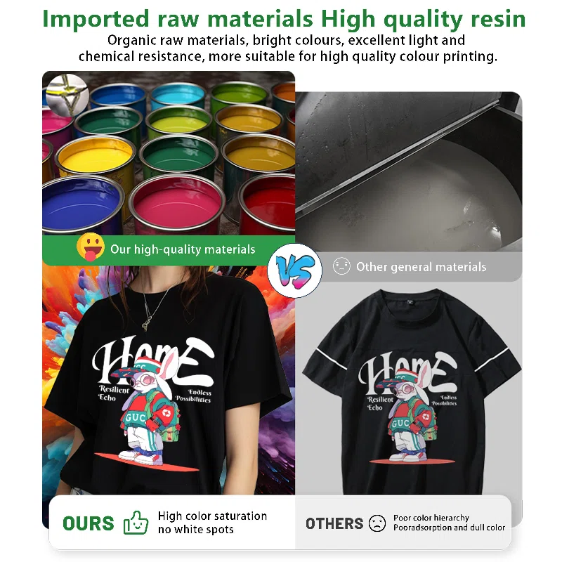 DTF printing does not require engraving and waste disposal, and the process is simple. The most important thing is that the heat transfer of dark fabrics is directly printed with color and white, and dark fabrics can be directly transferred as light fabrics.